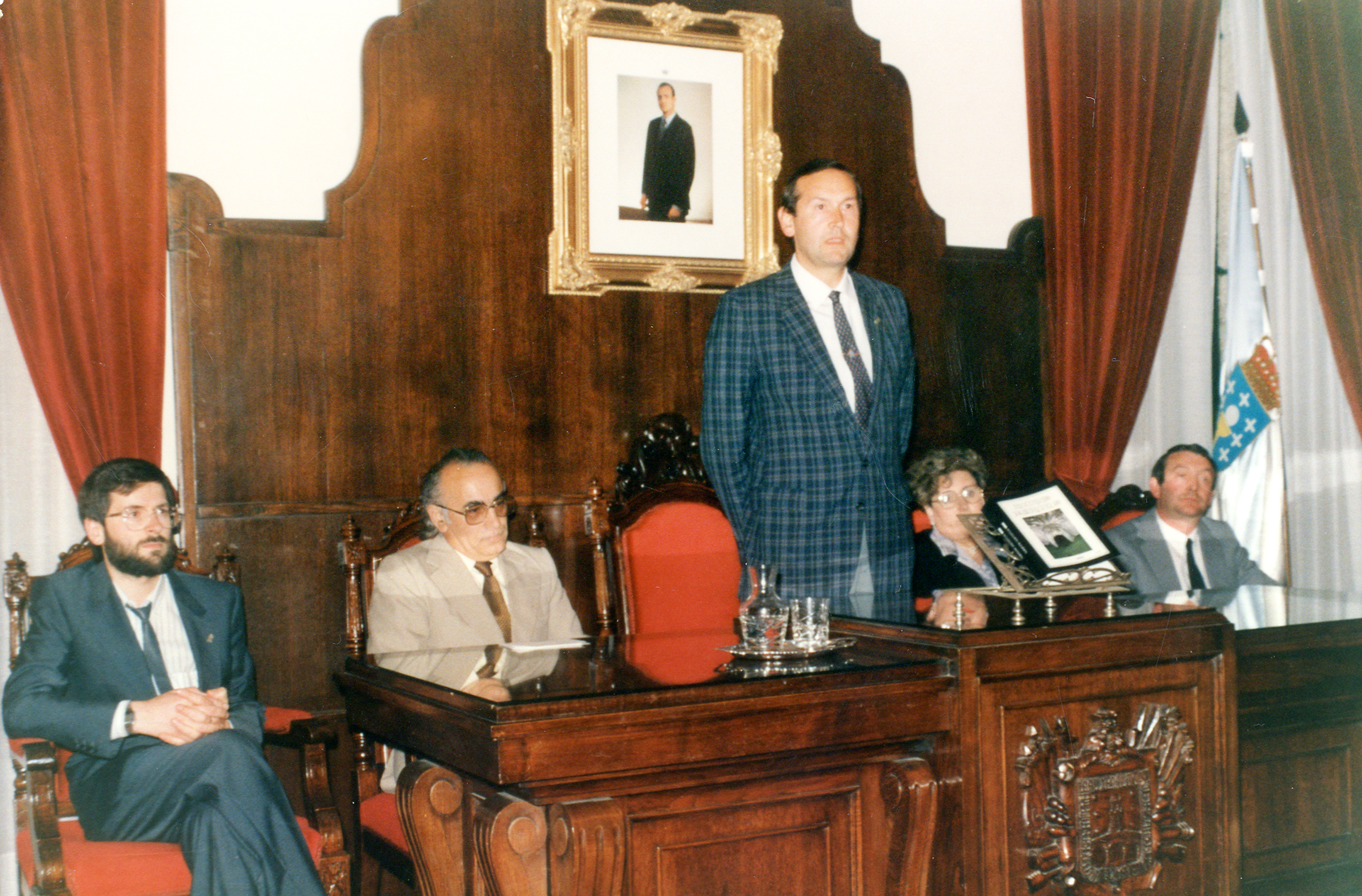 xuño de 1986). Alfredo Erias Martínez (director), Isidoro Millán González-Pardo, conde de Quirós (presentador, académico da Real Academia Galega), Manuel Lagares Pérez (alcalde) e Andrés Beade Dopico (concelleiro de Cultura). |