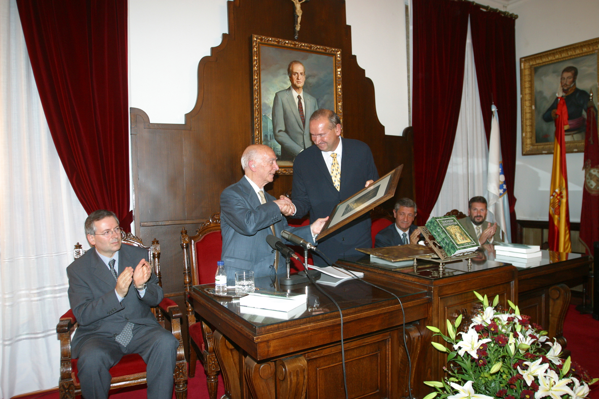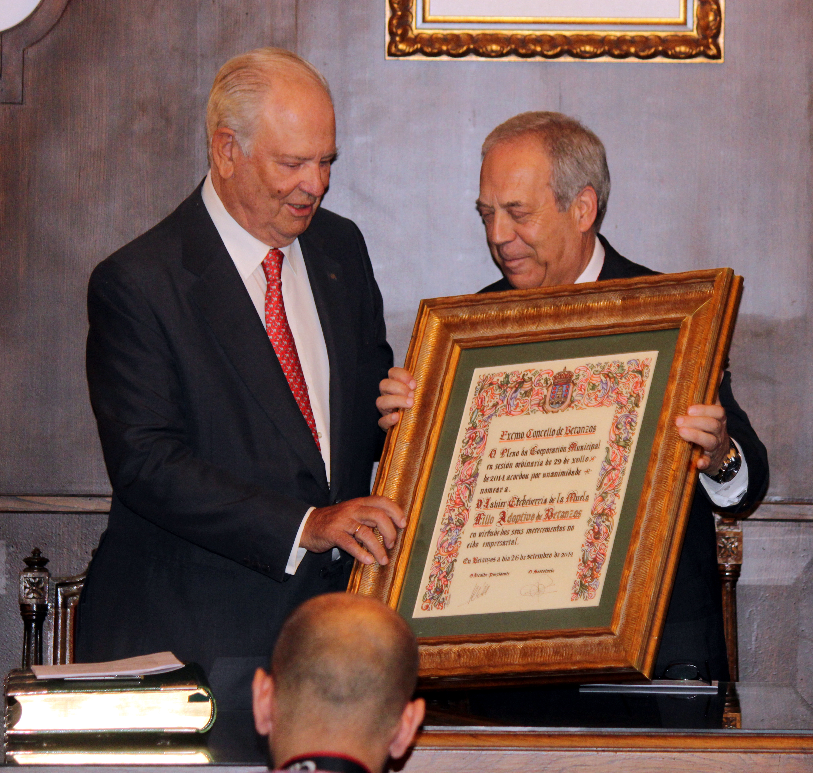 O alcalde Ramón García Vázquez entrega a Javier Etcheverría de la Muela o título de Fillo Adoptivo de Betanzos. Foto: Erias. |