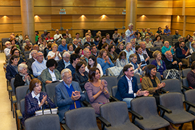 Vicente de la Fuente entrando (este número do Anuario Brigantino é o 40 sen interrupción desde que el, como alcalde, fixo que rexurdira no 1981). Alfredo Erias Martínez (director), a concelleira de Cultura en funcións de alcaldesa, Ana Belén Veiga Pita e Antolín Sánchez Presedo, presentador (alcalde que nomeou a Alfredo Erias director do Anuario Brigantino a principios de 1984). E Alfredo Erias coa súa dona, María Teresa Garea. Fotos: Arume. |